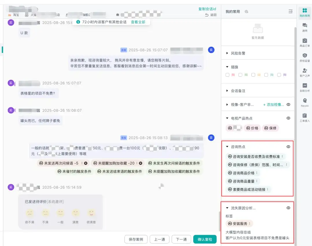 3、会话级场景追溯——客服专业度提升:结合 “咨询热点标签 + 流失原因标签 + 大模型总结”,还原单条会话的 “客户诉求 - 客服应答” 场景,为客服质检、话术优化提供具体依据。针对性对客服团队进行培训,强化国补相关服务能力,减少因沟通导致的流失。