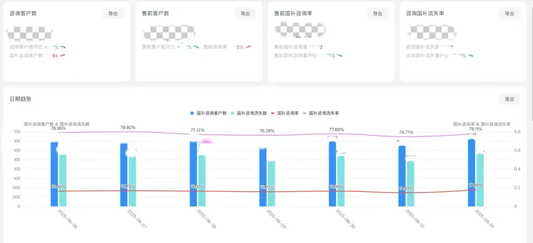 1、核心指标总览——全链路态势感知:快速呈现咨询量、售前客户数、国补咨询 / 流失率及环比,实时掌握国补业务的流量、转化、流失节奏,及时调整资源(如引流、客服分配),保障业务稳定。