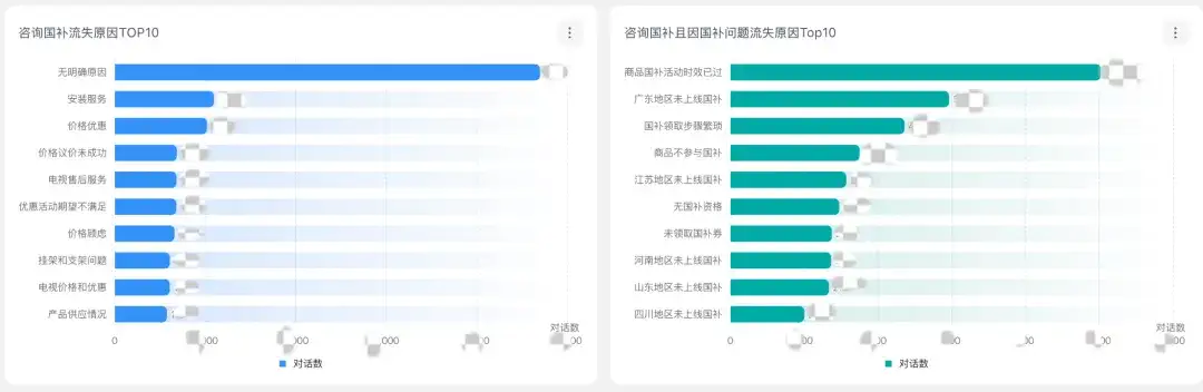 2、流失原因分层——服务精准优化:区分 “通用流失 TOP10” 与 “国补专属流失 TOP10” 国补专属流失原因(活动时效、区域覆盖、领取步骤繁琐等)直接指导国补模块的运营策略迭代;针对流失中与国补相关的安装服务、价格优惠等点,设计 “国补 + 服务 / 价格” 组合策略以提升吸引力。
